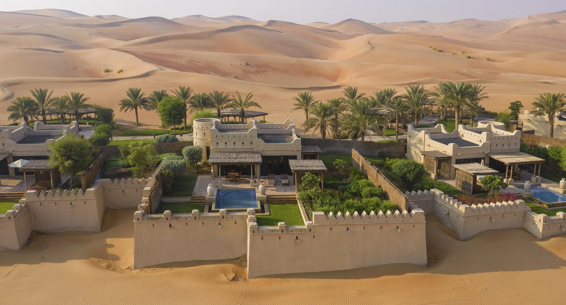 And then there’s Qasr Al Sarab Desert Resort by Anantara. Built like an ancient desert fortress rising from the dunes, it’s all towers, arches, and cinematic silence. This is where your Lawrence of Arabia fantasies come alive — sunrise over endless sand, candlelit courtyards, and a stillness that makes the city feel very far away.